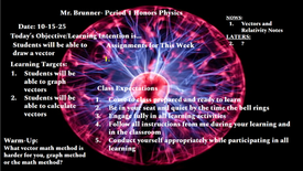 This week is a 4 day week due to a PD day for teachers happening on Friday. We will be continuing our study of vectors and relativity this week and continuing on the labs for this unit.