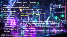 This week we will be finishing the test review on stoichiometry and taking the assessment on the unit on Wednesday. After that, we will then be moving onto the Gas Laws unit.